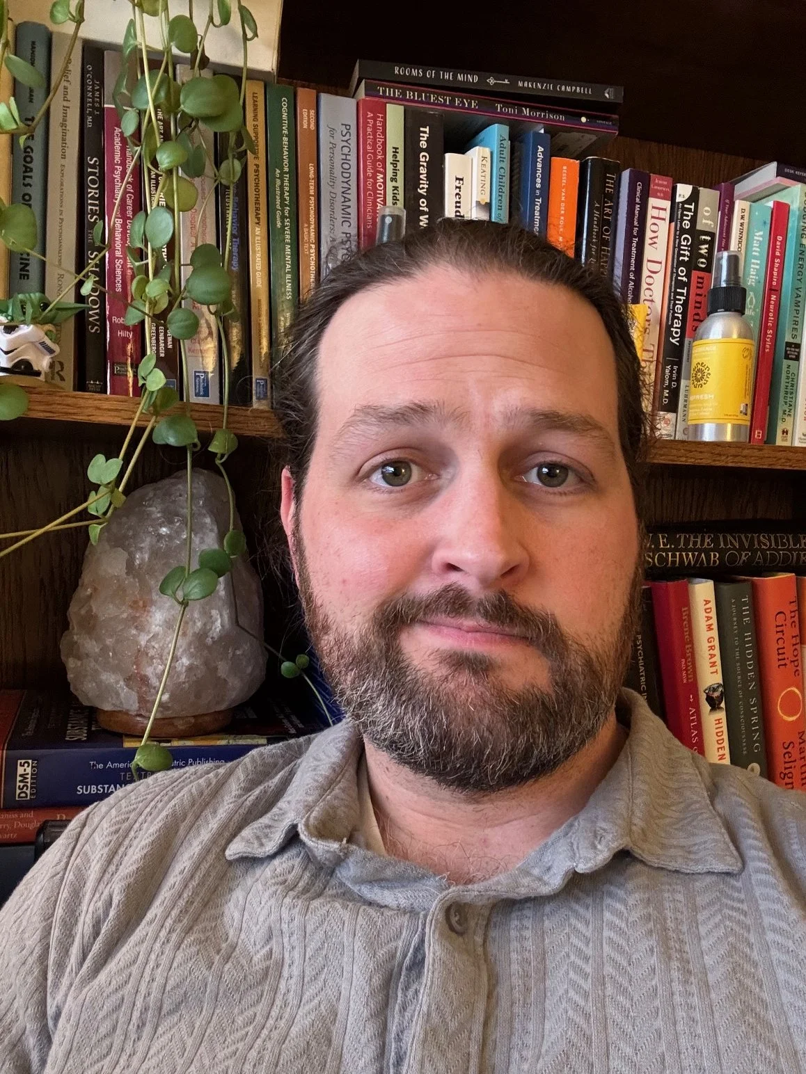A man with a beard and long hair taking a selfie at a desk with a computer monitor, keyboard, mouse, and a snack. Behind him is a whiteboard and cabinets.